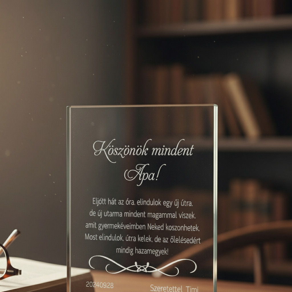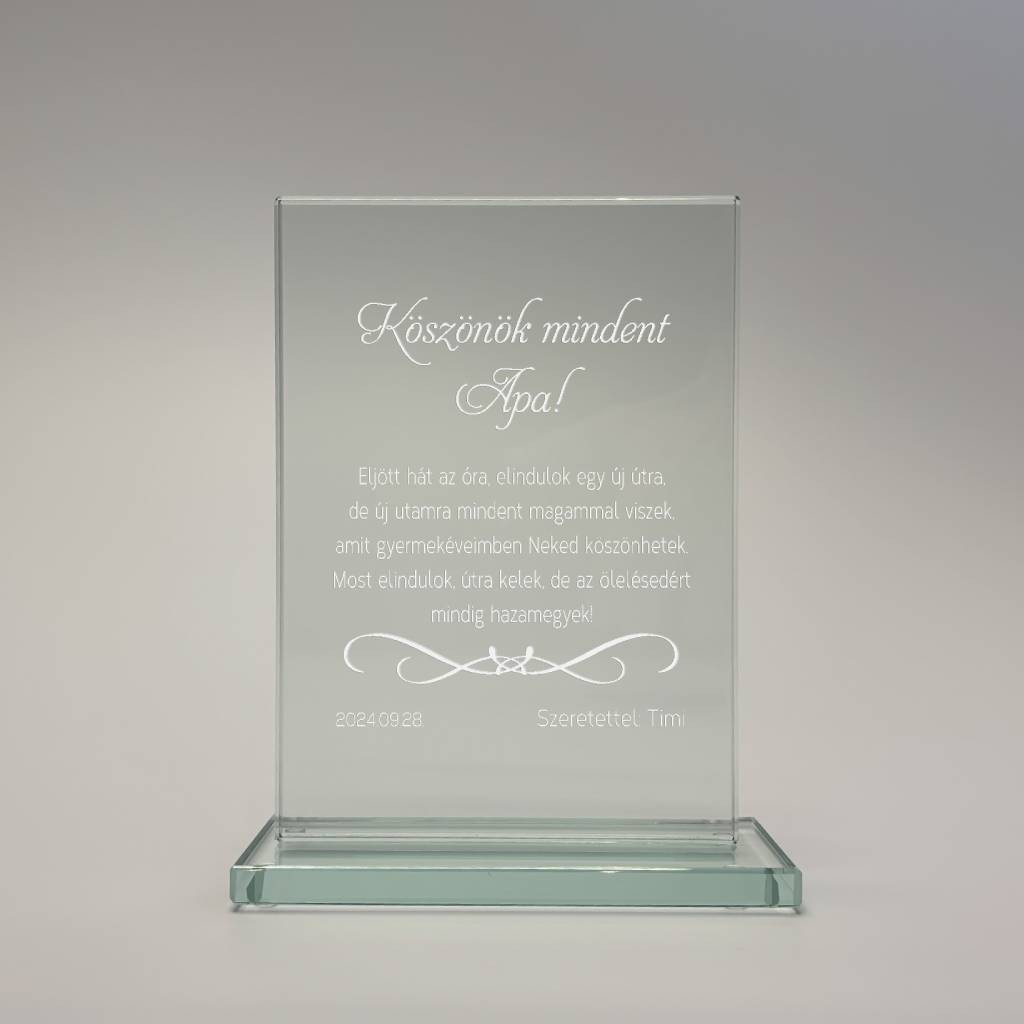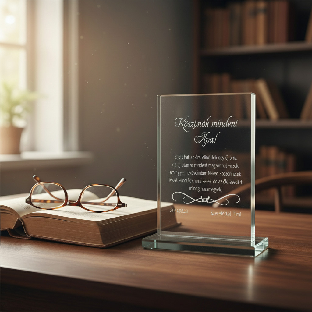 Elegáns, letisztult megjelenésű üvegplakett, amely apukáknak tökéletes választás ajándékba. A gravírozásnak köszönhetően teljesen egyedi. Több száz elégedett vásárlónk már megtapasztalta a gravírozás időtálló minőségét.