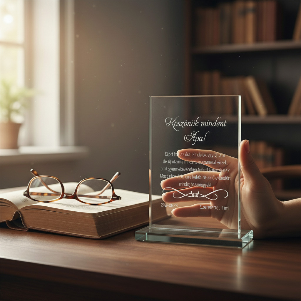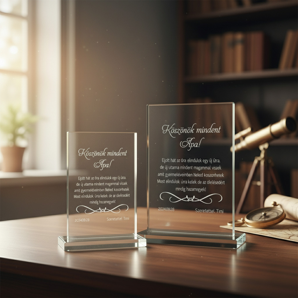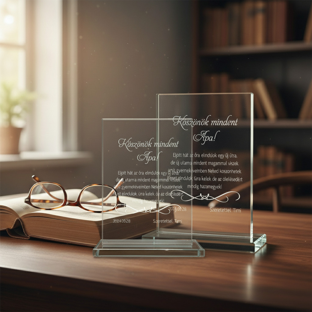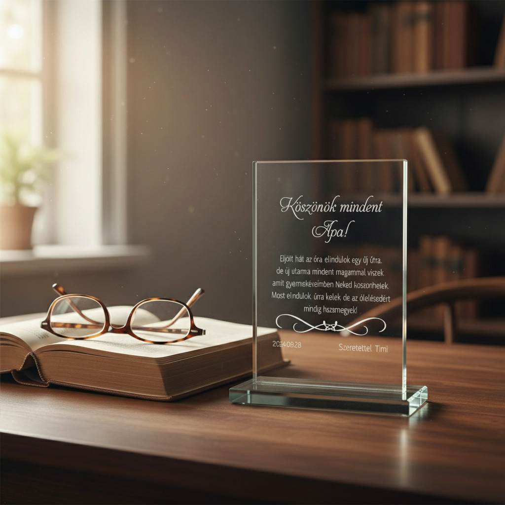 Elegáns, letisztult megjelenésű üvegplakett, amely apukáknak tökéletes választás ajándékba. A gravírozásnak köszönhetően teljesen egyedi. Több száz elégedett vásárlónk már megtapasztalta a gravírozás időtálló minőségét.